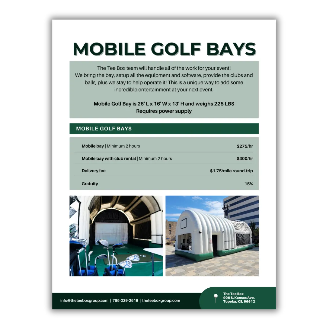 Mobile Golf Bay is 26' L x 16' W x 13' H and weighs 225 LBS